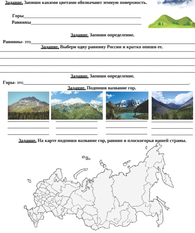 Рабочий лист к уроку окружающего мира по теме "Равнины и горы России", 4 класс, УМК "Школа России"
