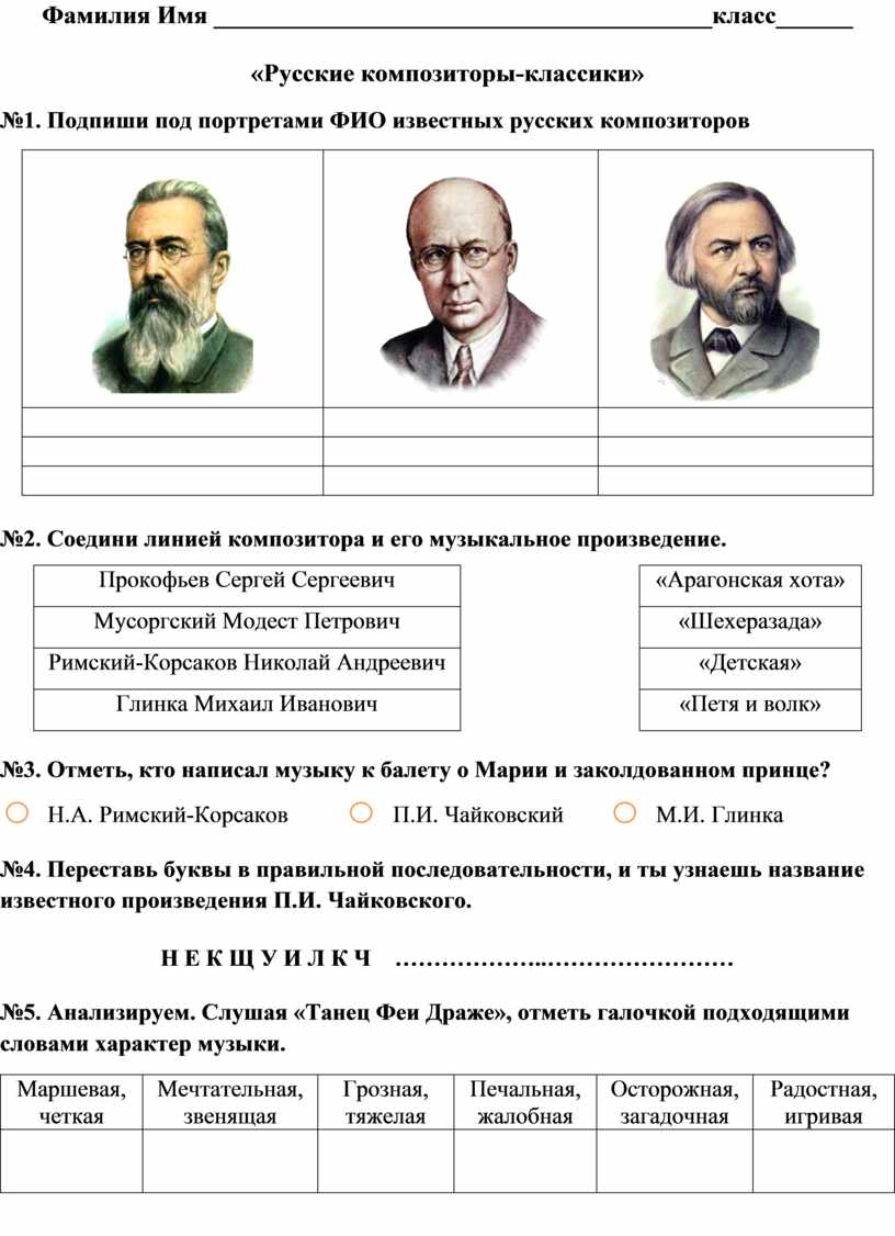 №1. Подпиши под портретами ФИО известных русских композиторов