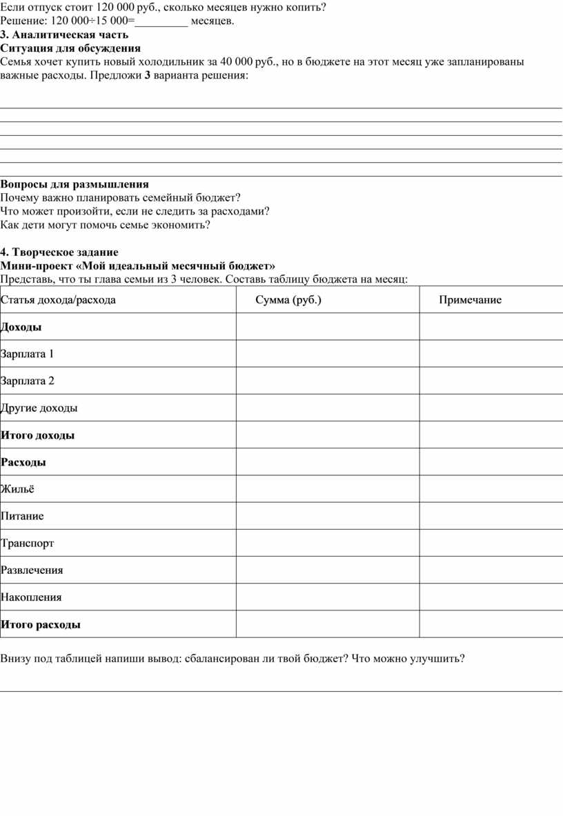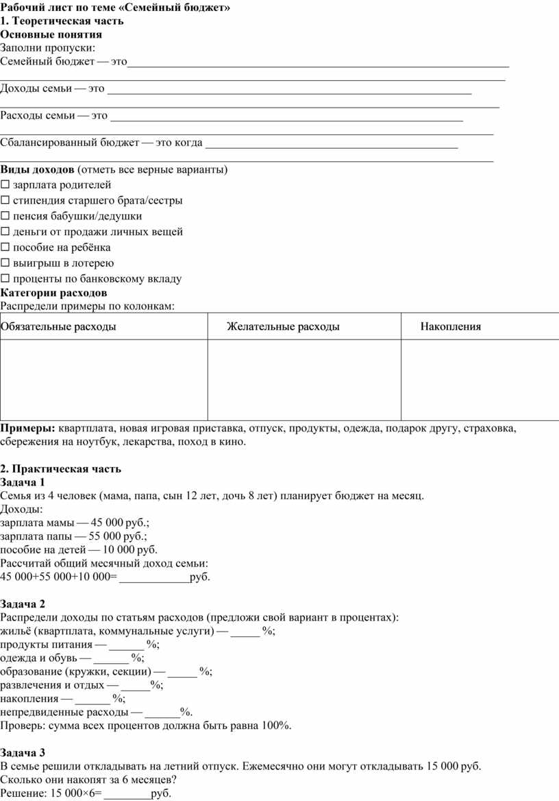 Рабочий лист по теме «Семейный бюджет»