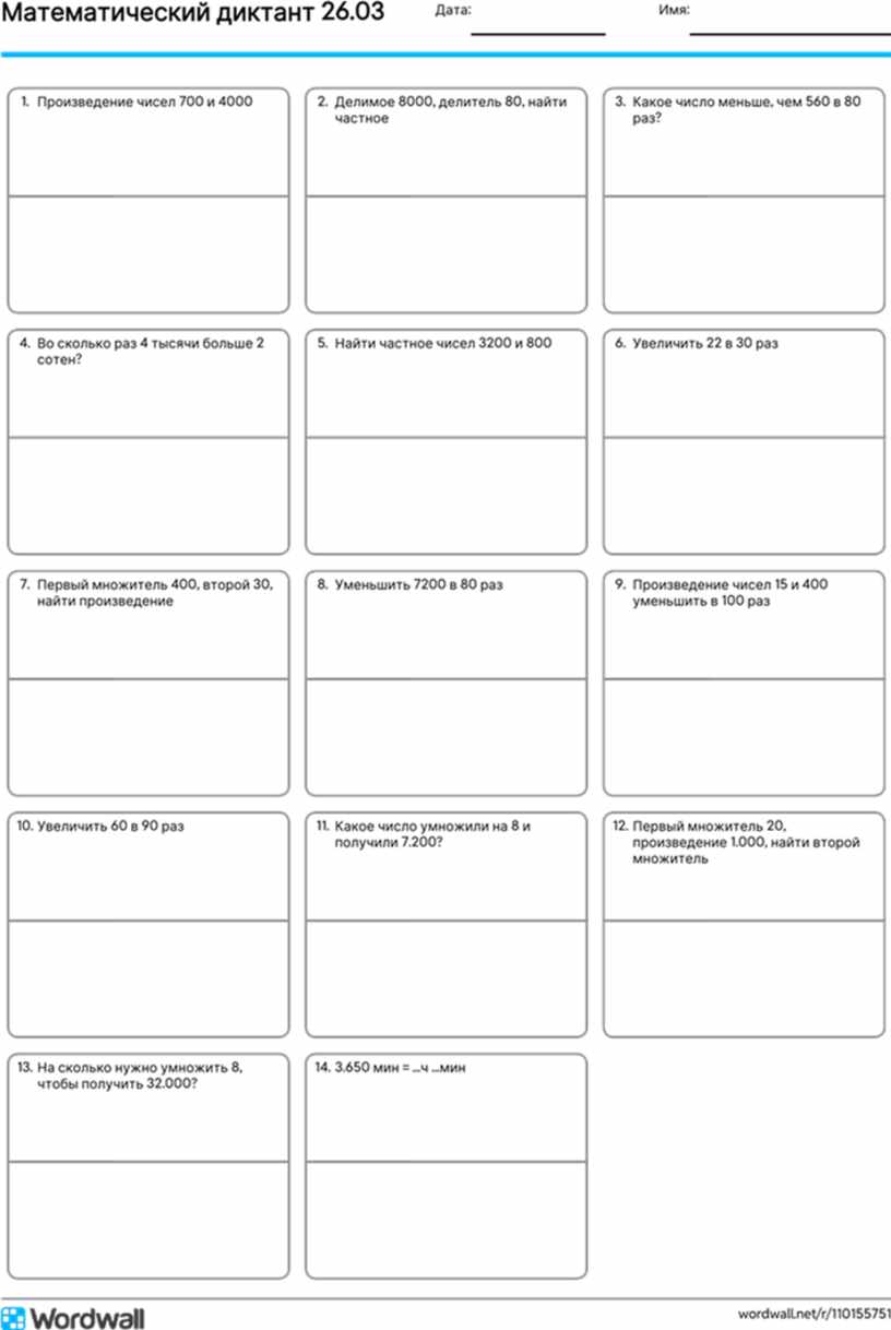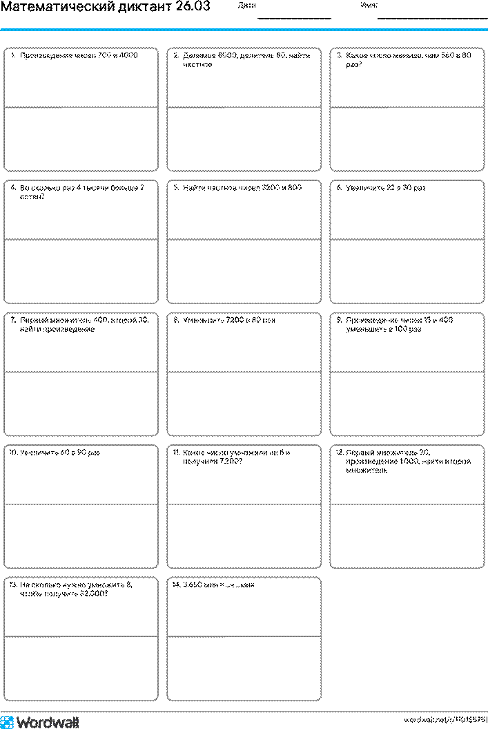 Бланк формата А4 с ячейками для записи числовых выражений, 14 заданий. 4 класс. Программа "Школа России"