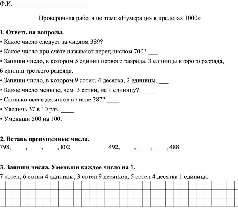 Проверочная работа по теме «Нумерация в пределах 1000»