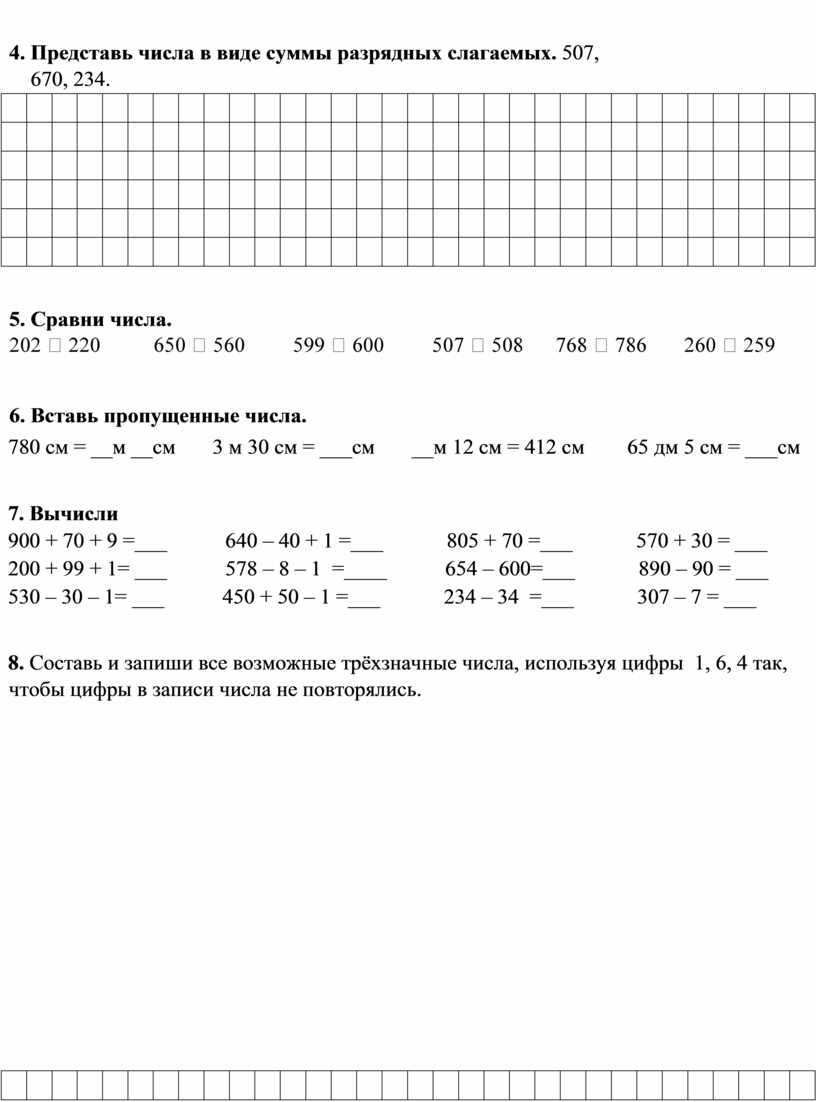 4. Представь числа в виде суммы разрядных слагаемых. 507, 670, 234.