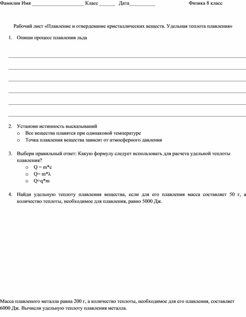 Рабочий лист «Плавление и отвердевание кристаллических веществ. Удельная теплота плавления»
