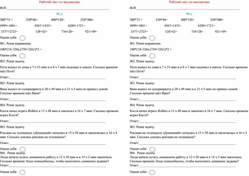 Рабочий лист по математике