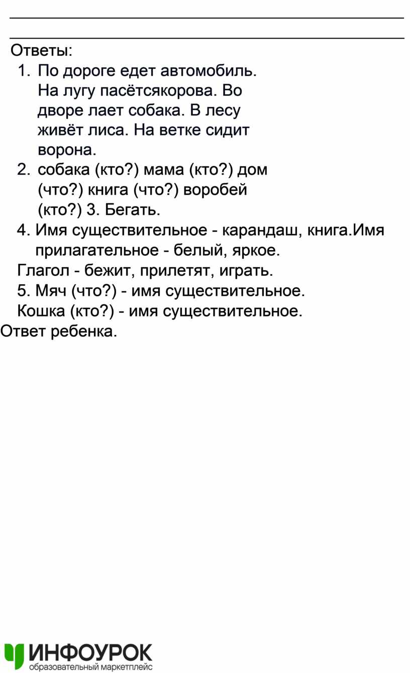 1. По дороге едет автомобиль. На лугу пасётсякорова. Во дворе лает собака. В лесу живёт лиса. На ветке сидит ворона.