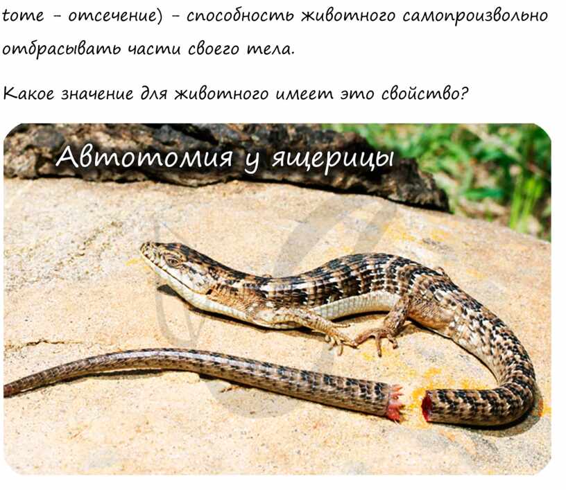 6 Вам с детства известно о том, что ящерицы могут отбрасывать свои хвосты. Это действительно так, для ящериц характерна автотомия (от греч. autos - сам и греч. tome - отсечение) - способность животного самопроизвольно отбрасывать части своего тела.