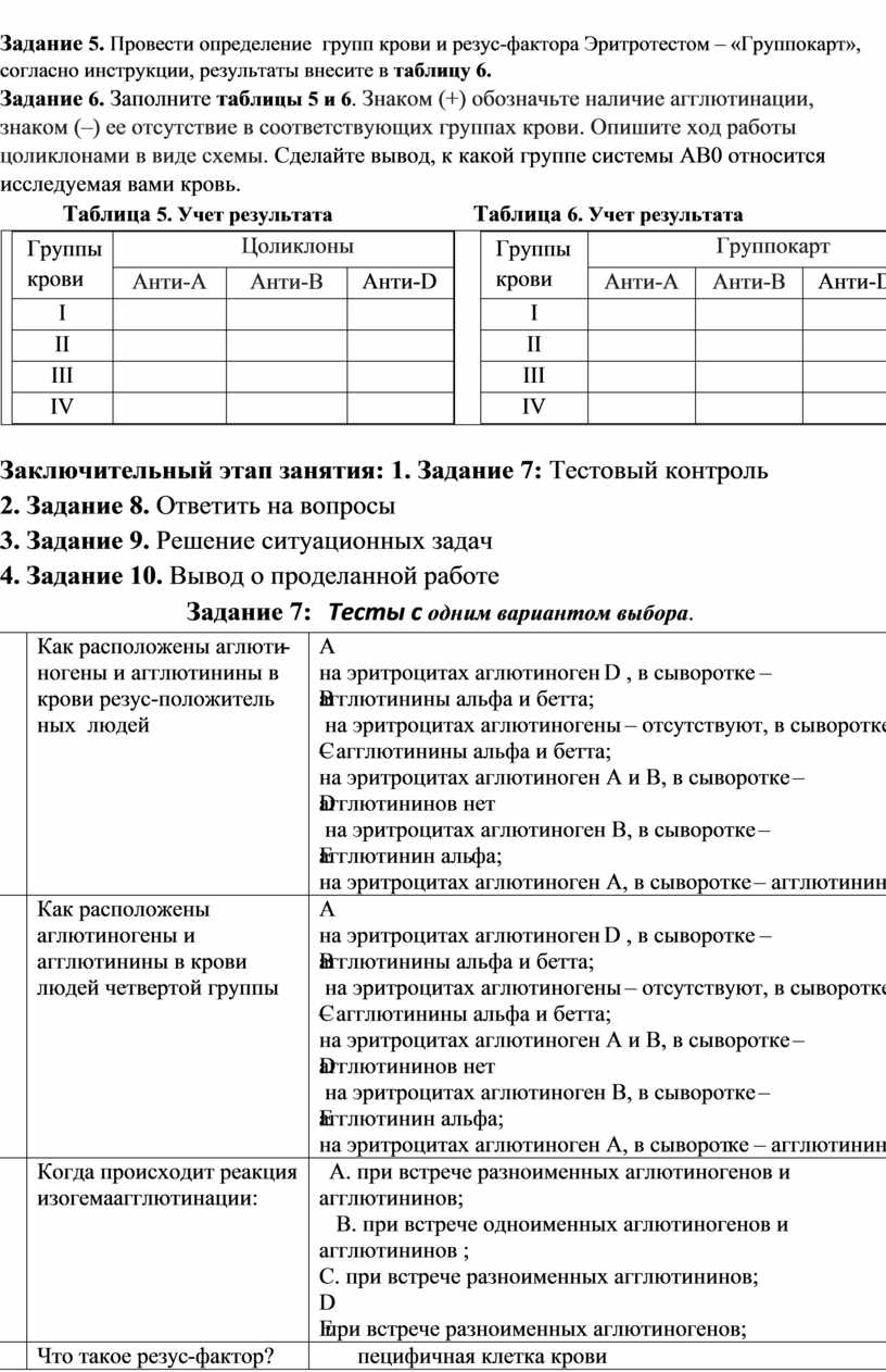 Задание 6. Заполните таблицы 5 и 6. Знаком (+) обозначьте наличие агглютинации, знаком (–) ее отсутствие в соответствующих группах крови. Опишите ход работы цоликлонами в виде схемы. Сделайте вывод, к какой группе системы АВ0 относится исследуемая вами кровь.