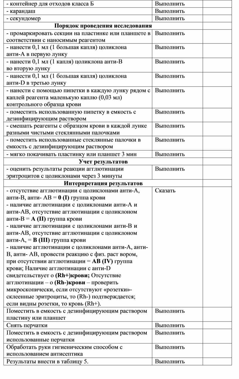 Задание 4. Отработайте технику выполнения метода определения группы крови системы АВО по оценочному листу.