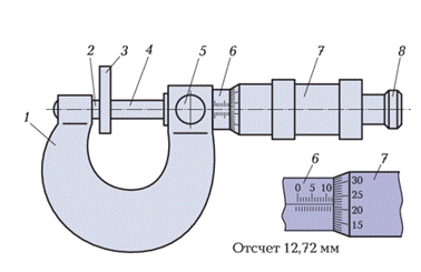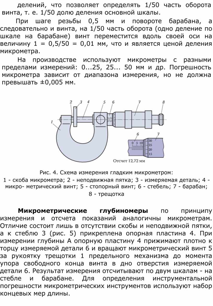 Результат измерений можно отсчитывать по двум шкалам: целые миллиметры по маленькой шкале 15 (рис. 6, б) со стрелкой, а доли миллиметра по большой шкале 4 со стрелкой 5.