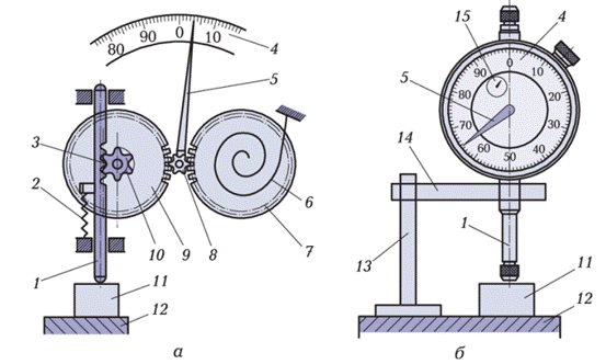 а - устройство; б - схема монтажа при измерениях; 1 - измерительный стержень; 2 - пружина; 3 - зубчатая рейка; 4 - шкала указателя для отсчета долей миллиметра; 5 - стрелка; 6 - спиральная пружина; 7, 8, 9 и 10 - зубчатые колеса: 11 - измеряемая деталь; 12 - инструментальная плита; 13 - стойка; 14 - кронштейн; 15 - шкала указателя для отсчета числа целых миллиметров