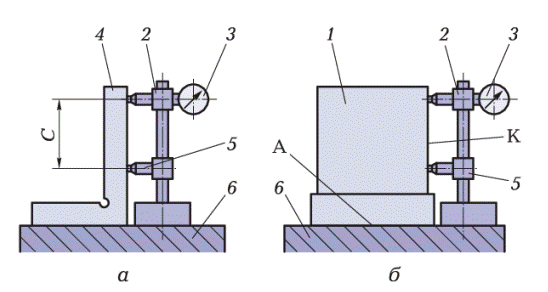 Рис. 10. Схема определения величины неперпендикулярности поверхностей: а - настройка индикатора в нулевое положение; б - измерение неперпендикулярности; 1 - проверяемая деталь; 2 - индикаторная стойка; 3 - индикатор; 4 - эталонный угольник; 5 - упор; 6 - инструментальная плита; А и К - проверяемые плоские поверхности; С - базовое расстояние -