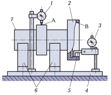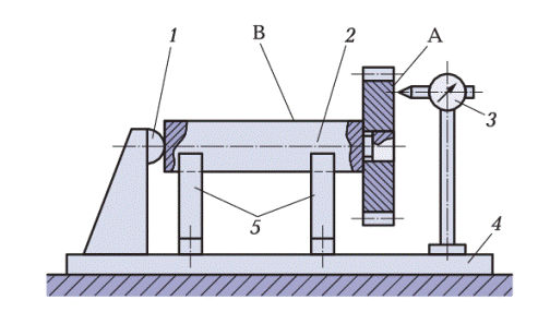Рис. 9. Схема измерения торцевого биения: - 1 - осевой упор; 2 - проверяемая деталь; 3 - индикатор часового типа; 4 - основание приспособления; 5 - установочные призмы; А - измеряемая поверхность; В - базовая поверхность