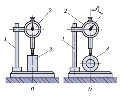 а - настройка индикатора в нулевое положение; б - измерение диаметра; 1 индикаторная стойка; 2 - индикатор часового типа; 3 - эталонный блок концевых мер длины; 4 - измеряемая деталь; К - отклонение стрелки от нуля