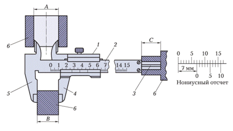 1 - подвижная рамка с нониусной шкалой; 2 - штанга с основной шкалой; 3 - линейка глубиномера; 4 - подвижная губка; 5 - неподвижная губка; 6 деталь; А, С и В - измеряемые параметры измеряемая