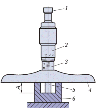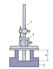 Рис. 2. Схема измерения штангенглубиномером: 1 - штанга с основной шкалой и рабочей нижней торцевой поверхностью; 2 - подвижная рамка с нониусной шкалой и базовым нижним основанием; 3 - измеряемая деталь; А - измеряемый параметр  |