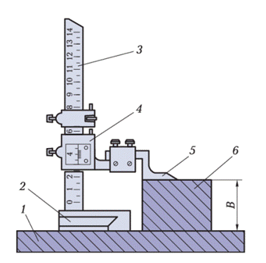 1 - инструментальная плита; 2 - основание; 3 - штанга с основной шкалой; 4 - подвижная рамка с нониусной шкалой; 5 - наконечник или измерительная головка; 6 - измеряемая деталь; В - измеряемый параметр