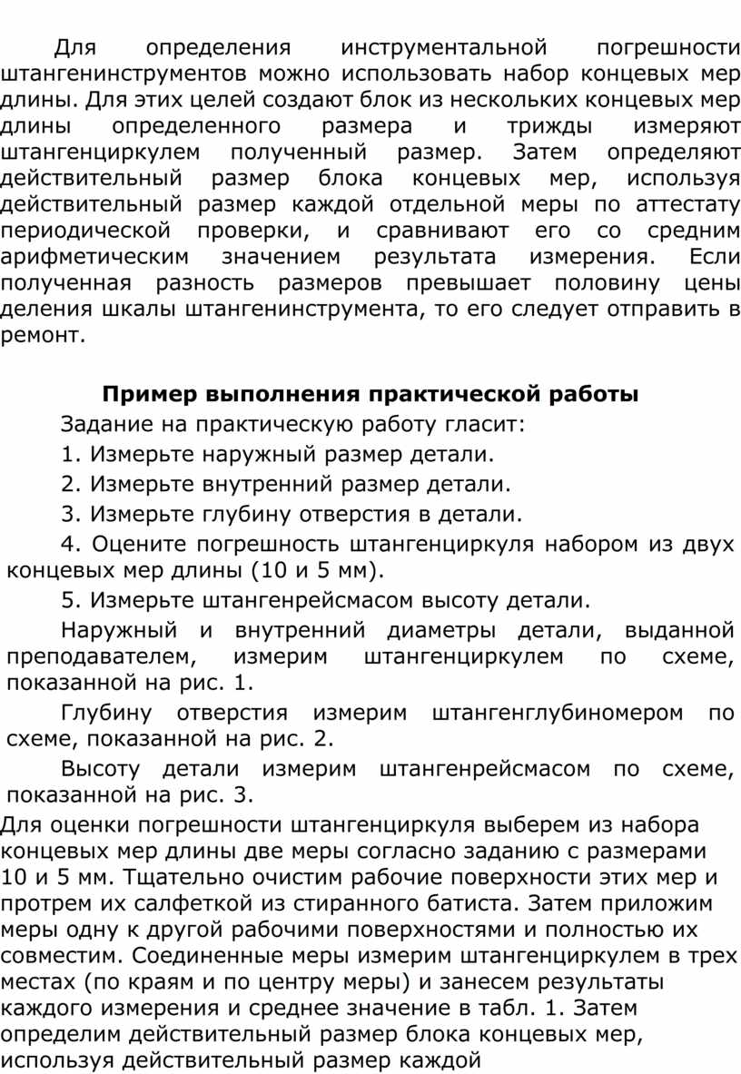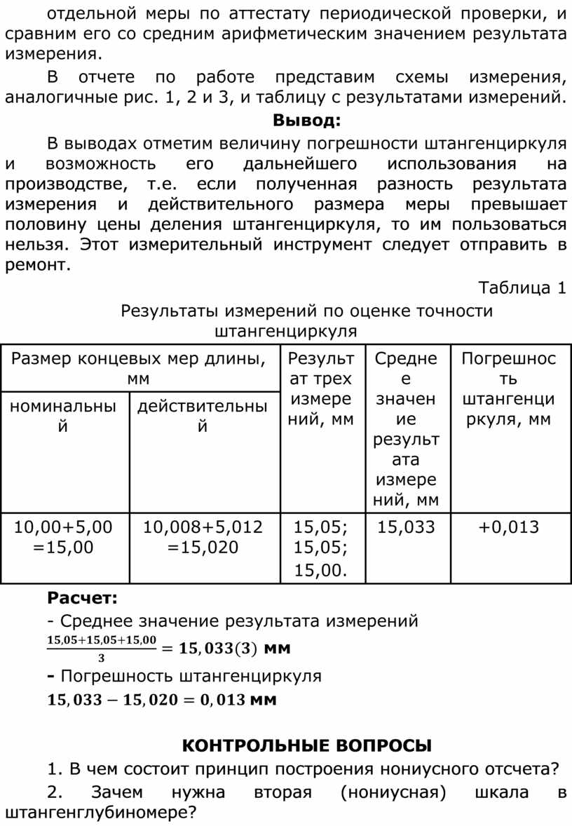 Для оценки погрешности штангенциркуля выберем из набора концевых мер длины две меры согласно заданию с размерами 10 и 5 мм. Тщательно очистим рабочие поверхности этих мер и протрем их салфеткой из стиранного батиста. Затем приложим меры одну к другой рабочими поверхностями и полностью их совместим. Соединенные меры измерим штангенциркулем в трех местах (по краям и по центру меры) и занесем результаты каждого измерения и среднее значение в табл. 1. Затем определим действительный размер блока концевых мер, используя действительный размер каждой отдельной меры по аттестату периодической проверки, и сравним его со средним арифметическим значением результата измерения.