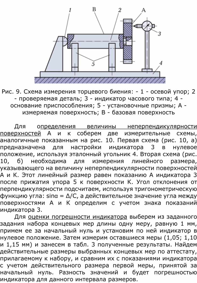 Для измерения торцевого биения поверхности А относительно оси поверхности В соберем измерительное устройство аналогично показанному на рис. 9, обратив особое внимание на надежность взаимодействия проверяемой детали 2 с осевым упором 1. Затем создадим небольшой натяг в индикаторе 3 часового типа и установим его стрелки в нулевое положение. Плавно проворачивая проверяемую деталь, не отрывая ее от осевого упора 1, выберем из показаний индикатора 3 часового типа максимальное, что и будет соответствовать наибольшей величине торцевого биения поверхности А относительно оси, опирающейся на установочные призмы 5 поверхности В.