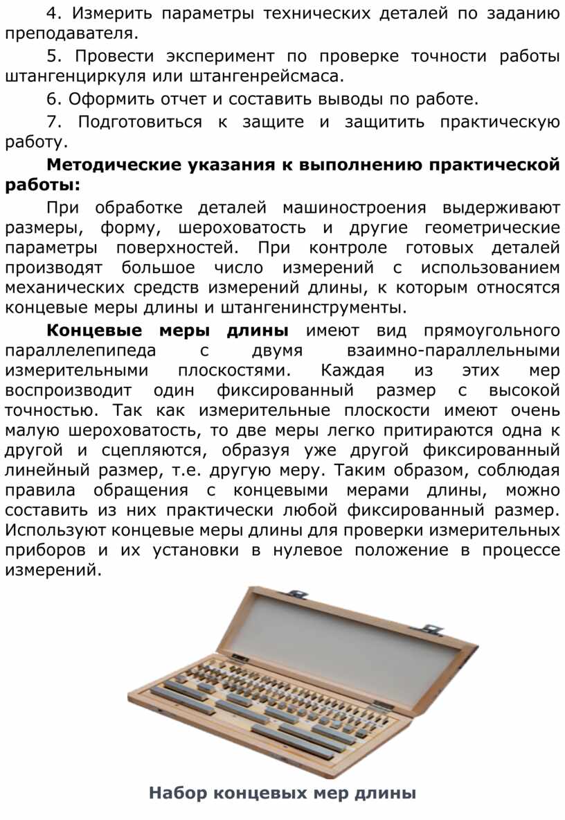 При обработке деталей машиностроения выдерживают размеры, форму, шероховатость и другие геометрические параметры поверхностей. При контроле готовых деталей производят большое число измерений с использованием механических средств измерений длины, к которым относятся концевые меры длины и штангенинструменты.