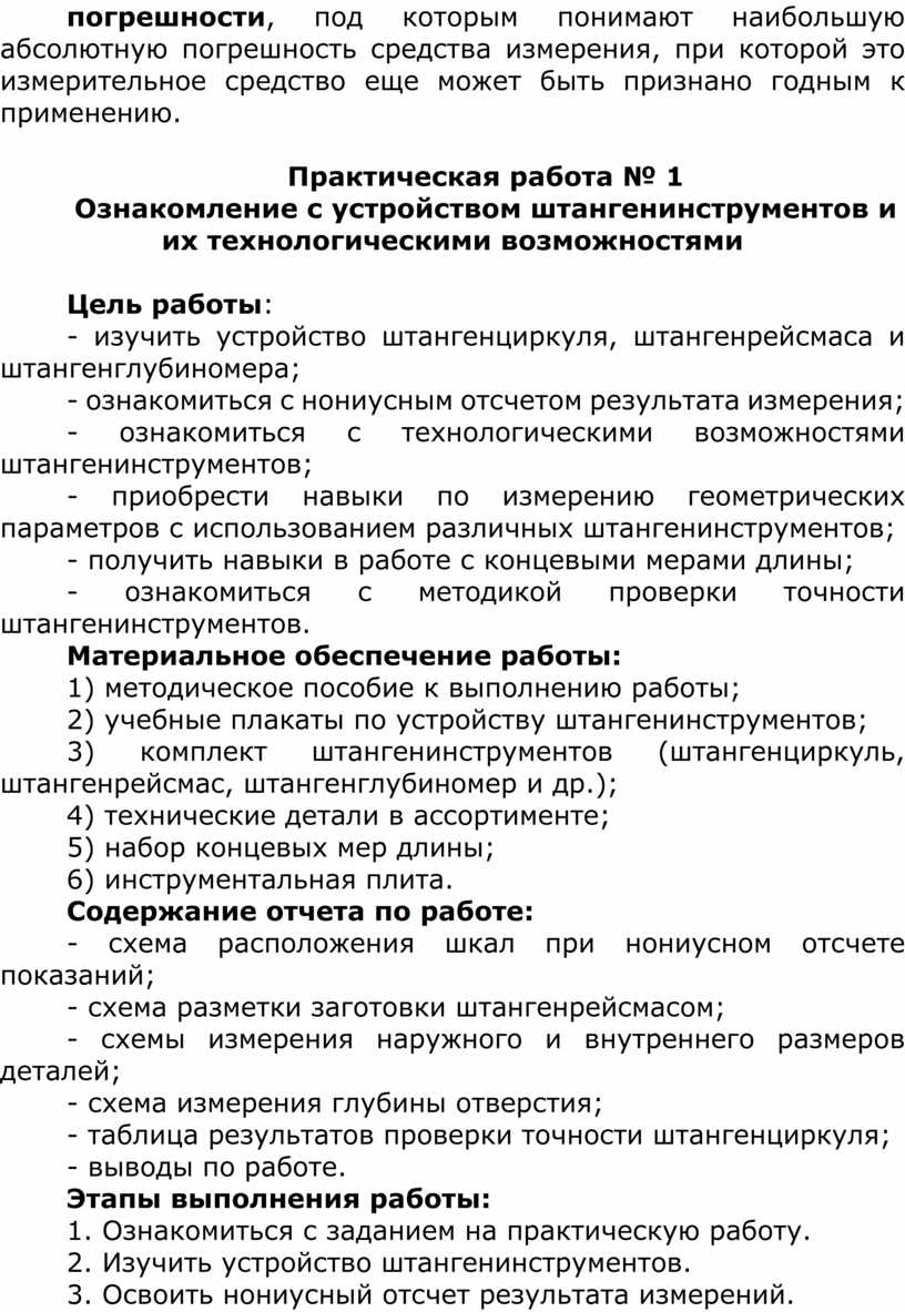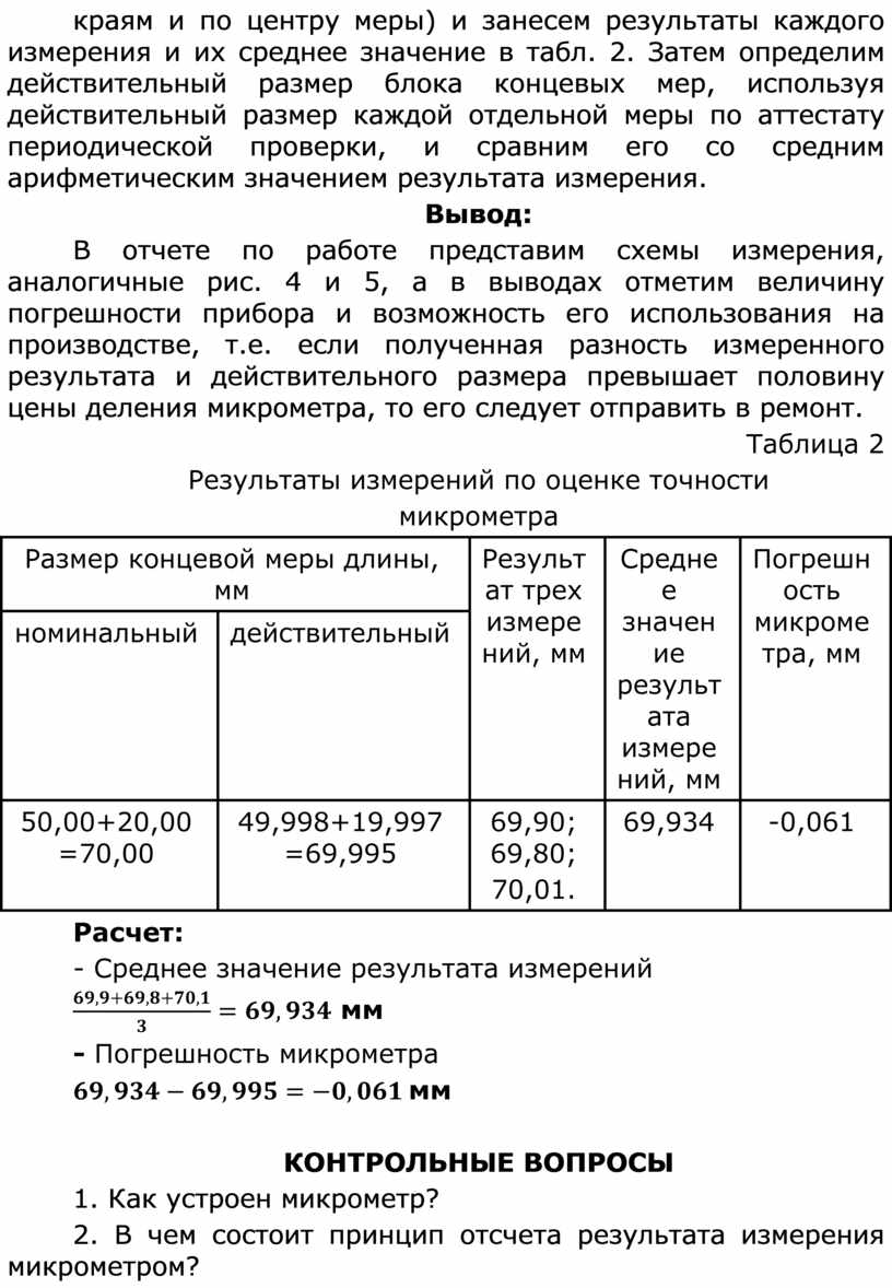 В выводах отметим величину погрешности штангенциркуля и возможность его дальнейшего использования на производстве, т.е. если полученная разность результата измерения и действительного размера меры превышает половину цены деления штангенциркуля, то им пользоваться нельзя. Этот измерительный инструмент следует отправить в ремонт.
