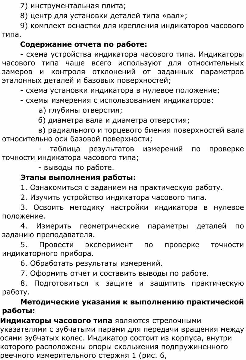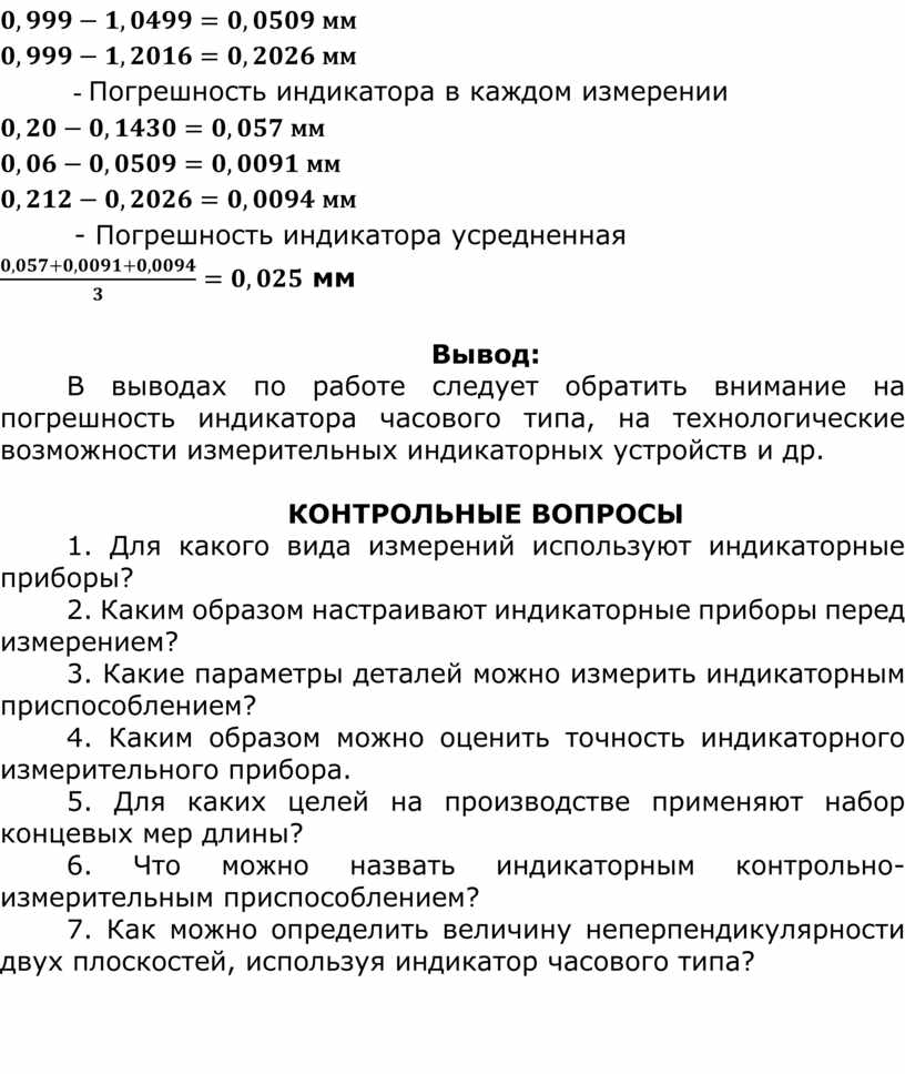 В выводах по работе следует обратить внимание на погрешность индикатора часового типа, на технологические возможности измерительных индикаторных устройств и др.