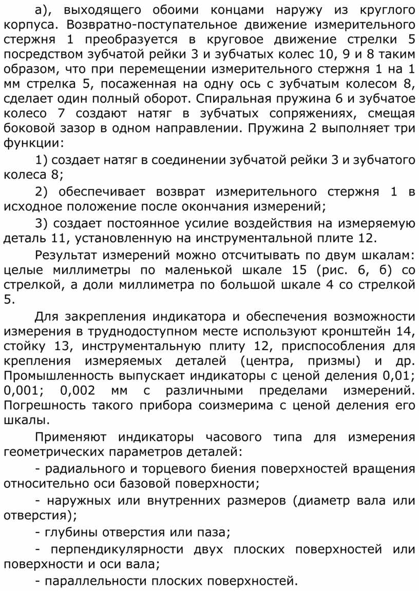 Индикаторы часового типа являются стрелочными указателями с зубчатыми парами для передачи вращения между осями зубчатых колес. Индикатор состоит из корпуса, внутри которого расположены опоры скольжения подпружиненного реечного измерительного стержня 1 (рис. 6, а), выходящего обоими концами наружу из круглого корпуса. Возвратно-поступательное движение измерительного стержня 1 преобразуется в круговое движение стрелки 5 посредством зубчатой рейки 3 и зубчатых колес 10, 9 и 8 таким образом, что при перемещении измерительного стержня 1 на 1 мм стрелка 5, посаженная на одну ось с зубчатым колесом 8, сделает один полный оборот. Спиральная пружина 6 и зубчатое колесо 7 создают натяг в зубчатых сопряжениях, смещая боковой зазор в одном направлении. Пружина 2 выполняет три функции: