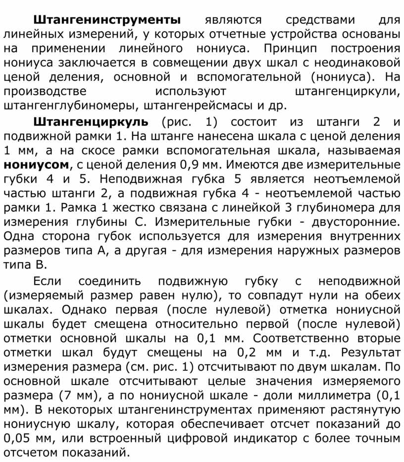 Штангенциркуль (рис. 1) состоит из штанги 2 и подвижной рамки 1. На штанге нанесена шкала с ценой деления 1 мм, а на скосе рамки вспомогательная шкала, называемая нониусом, с ценой деления 0,9 мм. Имеются две измерительные губки 4 и 5. Неподвижная губка 5 является неотъемлемой частью штанги 2, а подвижная губка 4 - неотъемлемой частью рамки 1. Рамка 1 жестко связана с линейкой 3 глубиномера для измерения глубины С. Измерительные губки - двусторонние. Одна сторона губок используется для измерения внутренних размеров типа А, а другая - для измерения наружных размеров типа В.