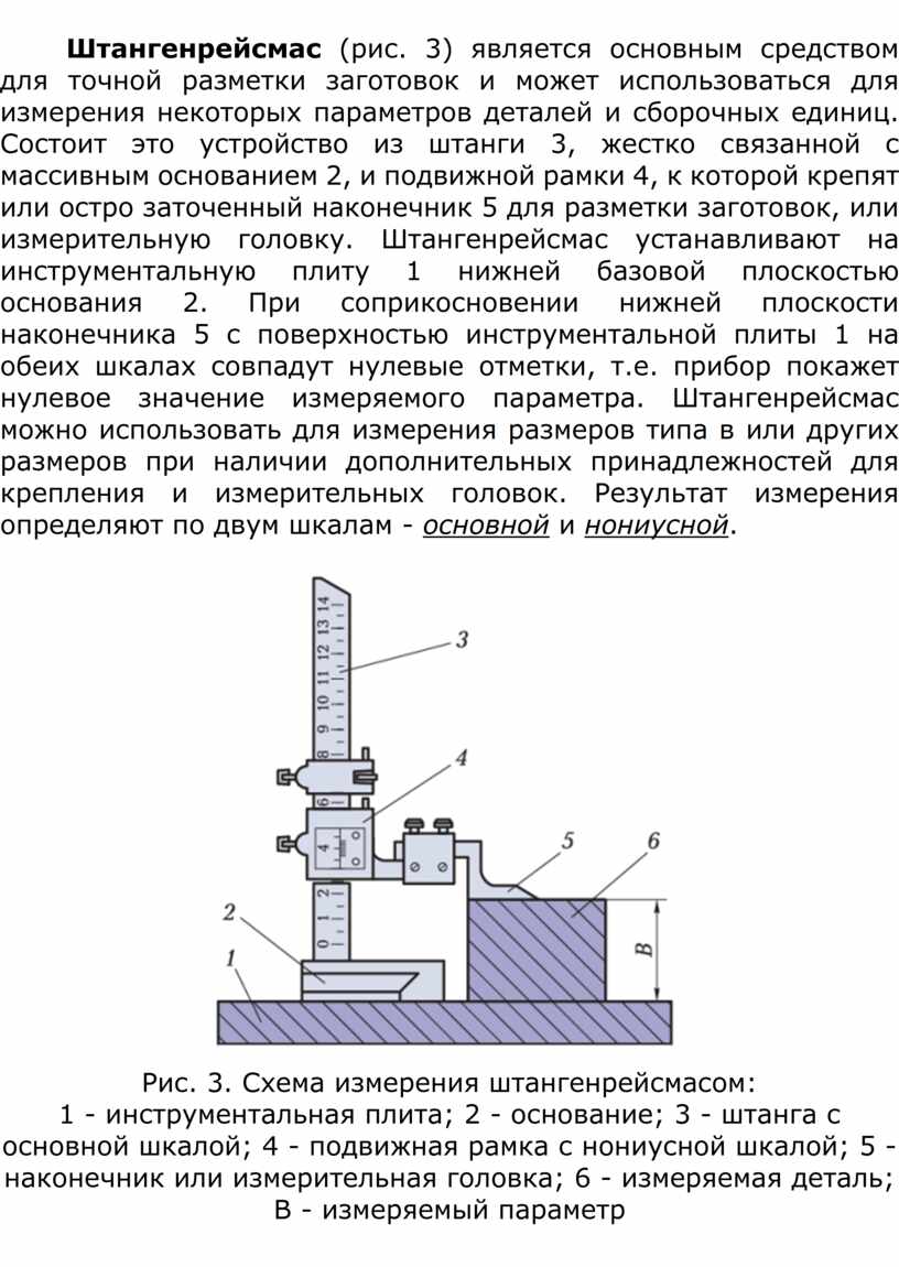 Штангенрейсмас (рис. 3) является основным средством для точной разметки заготовок и может использоваться для измерения некоторых параметров деталей и сборочных единиц. Состоит это устройство из штанги 3, жестко связанной с массивным основанием 2, и подвижной рамки 4, к которой крепят или остро заточенный наконечник 5 для разметки заготовок, или измерительную головку. Штангенрейсмас устанавливают на инструментальную плиту 1 нижней базовой плоскостью основания 2. При соприкосновении нижней плоскости наконечника 5 с поверхностью инструментальной плиты 1 на обеих шкалах совпадут нулевые отметки, т.е. прибор покажет нулевое значение измеряемого параметра. Штангенрейсмас можно использовать для измерения размеров типа в или других размеров при наличии дополнительных принадлежностей для крепления и измерительных головок. Результат измерения определяют по двум шкалам - основной и нониусной.