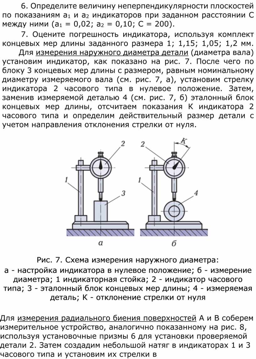 7. Оцените погрешность индикатора, используя комплект концевых мер длины заданного размера 1; 1,15; 1,05; 1,2 мм. Для измерения наружного диаметра детали (диаметра вала) установим индикатор, как показано на рис. 7. После чего по блоку 3 концевых мер длины с размером, равным номинальному диаметру измеряемого вала (см. рис. 7, а), установим стрелку индикатора 2 часового типа в нулевое положение. Затем, заменив измеряемой деталью 4 (см. рис. 7, б) эталонный блок концевых мер длины, отсчитаем показания К индикатора 2 часового типа и определим действительный размер детали с учетом направления отклонения стрелки от нуля.