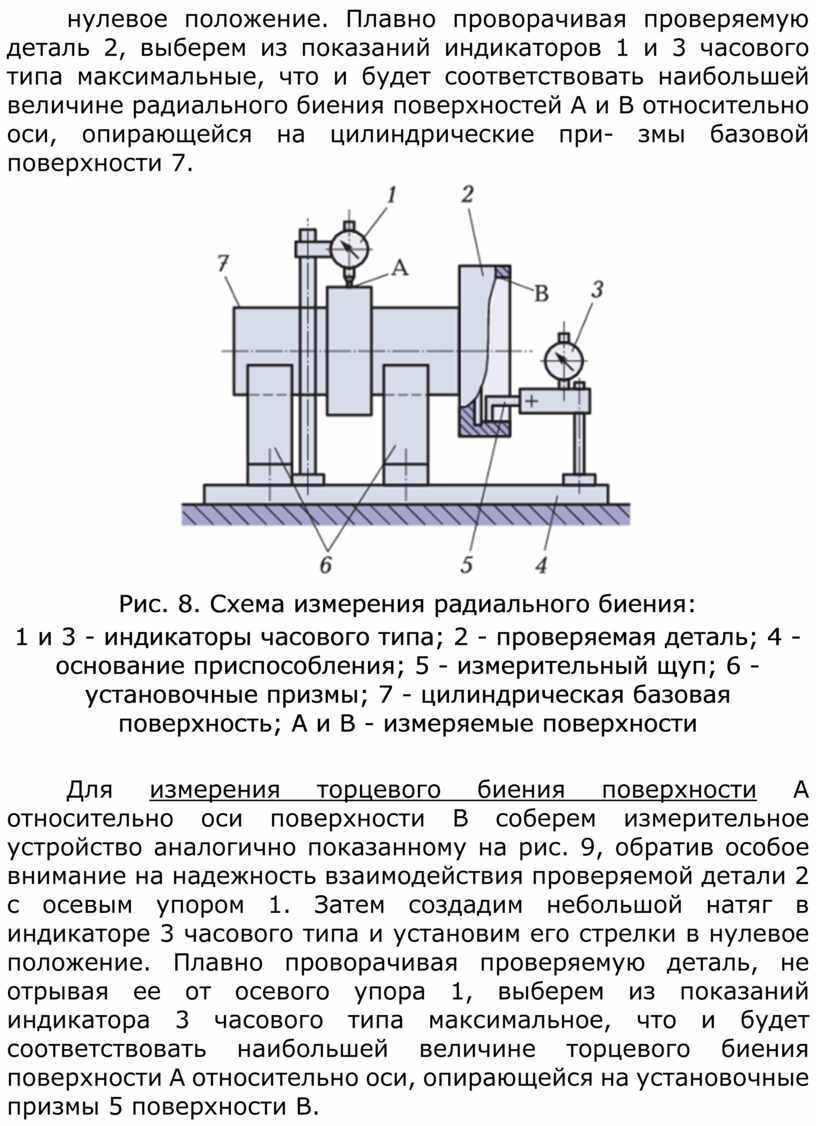 Для измерения радиального биения поверхностей А и В соберем измерительное устройство, аналогично показанному на рис. 8, используя установочные призмы 6 для установки проверяемой детали 2. Затем создадим небольшой натяг в индикаторах 1 и 3 часового типа и установим их стрелки в нулевое положение. Плавно проворачивая проверяемую деталь 2, выберем из показаний индикаторов 1 и 3 часового типа максимальные, что и будет соответствовать наибольшей величине радиального биения поверхностей А и В относительно оси, опирающейся на цилиндрические при- змы базовой поверхности 7.
