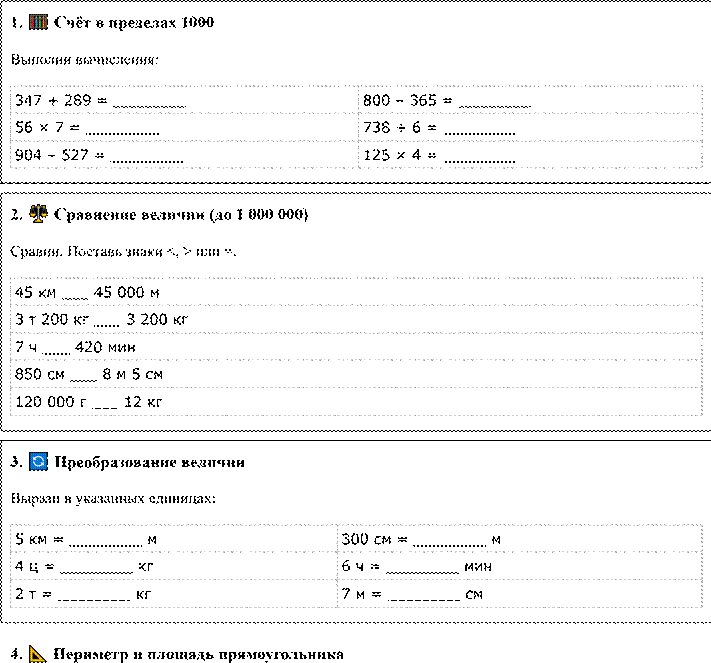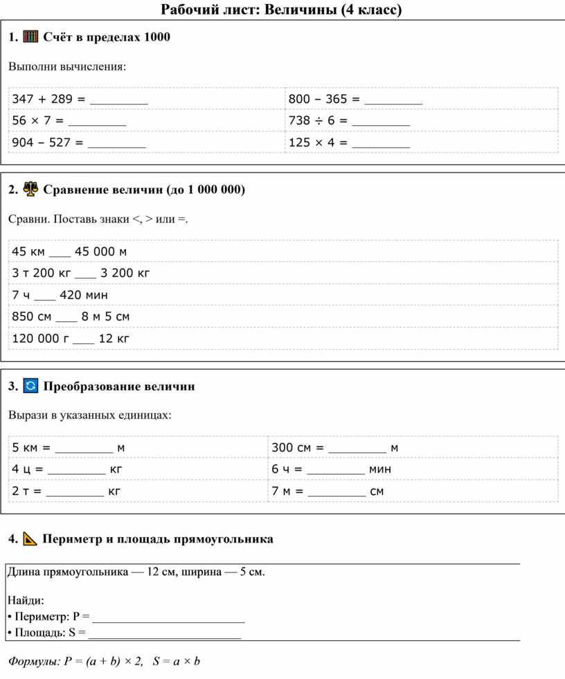 Рабочий лист: Величины (4 класс)