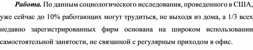Работа. По данным социологического исследования, проведенного в США, уже сейчас до 10% работающих могут трудиться, не выходя из дома, а 1/3 всех недавно зарегистрированных фирм основана на широком использовании самостоятельной занятости, не связанной с регулярным приходом в офис.