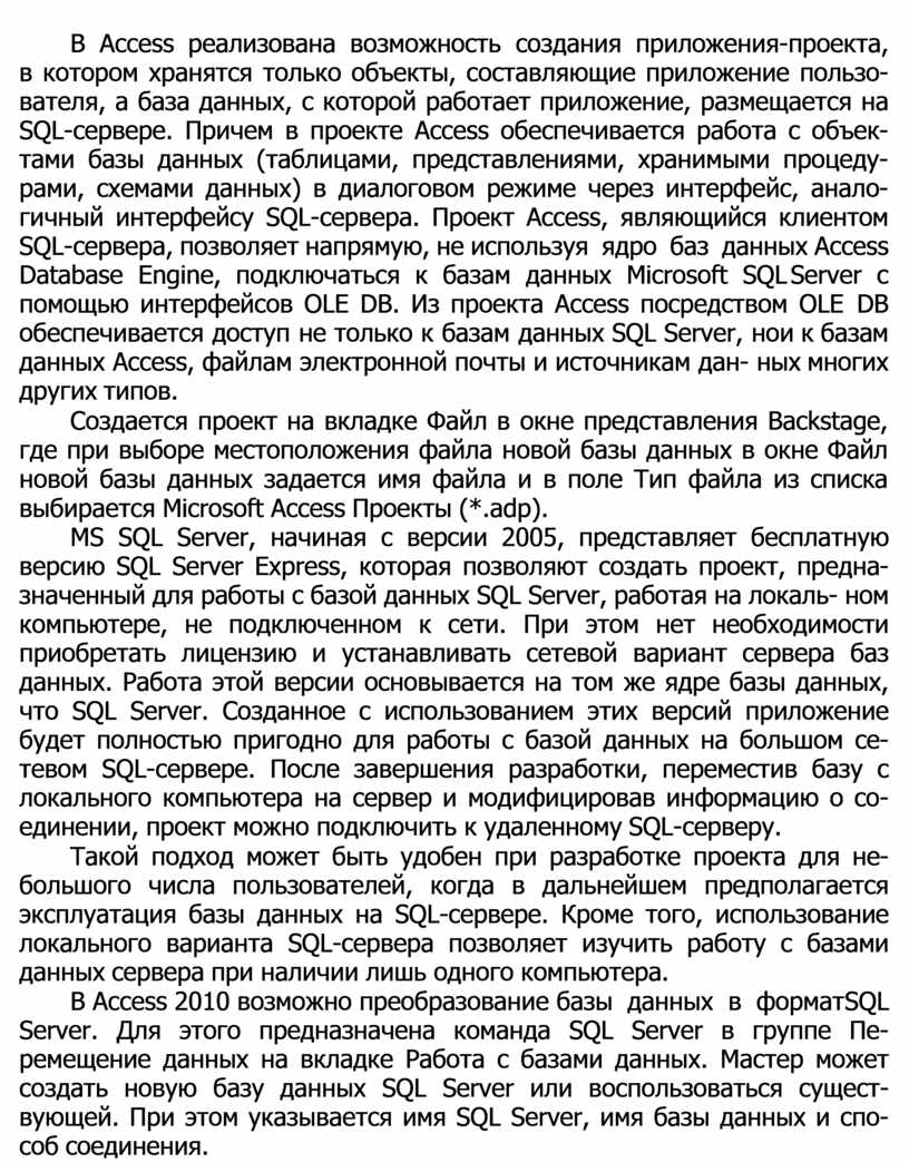 В Access реализована возможность создания приложения-проекта, в котором хранятся только объекты, составляющие приложение пользо- вателя, а база данных, с которой работает приложение, размещается на SQL-сервере. Причем в проекте Access обеспечивается работа с объек- тами базы данных (таблицами, представлениями, хранимыми процеду- рами, схемами данных) в диалоговом режиме через интерфейс, анало- гичный интерфейсу SQL-сервера. Проект Access, являющийся клиентом SQL-сервера, позволяет напрямую, не используя ядро баз данных Access Database Engine, подключаться к базам данных Microsoft SQL Server с помощью интерфейсов OLE DB. Из проекта Access посредством OLE DB обеспечивается доступ не только к базам данных SQL Server, но и к базам данных Access, файлам электронной почты и источникам дан- ных многих других типов.