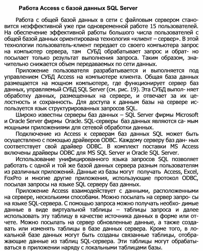 Приложение пользователя разрабатывается и выполняется под управлением СУБД Access на компьютере клиента. Общая база данных размещается на мощном компьютере, где функционирует сервер баз данных, управляемый СУБД SQL Server (см. рис. 19). Эта СУБД выпол- няет обработку данных, размещенных на сервере, и отвечает за их це- лостность и сохранность. Для доступа к данным базы на сервере ис- пользуется язык структурированных запросов SQL.