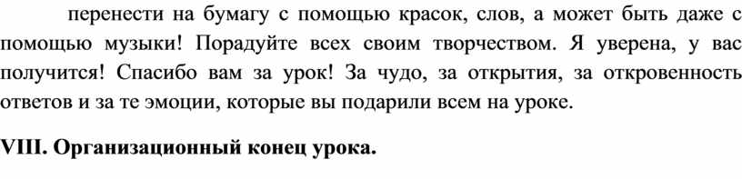 Учитель: - Подготовьтесь к выразительному чтению рассказа. Все ваши мысли, эмоции, впечатления о сегодняшнем уроке попробуйте перенести на бумагу с помощью красок, слов, а может быть даже с помощью музыки! Порадуйте всех своим творчеством. Я уверена, у вас получится! Спасибо вам за урок! За чудо, за открытия, за откровенность ответов и за те эмоции, которые вы подарили всем на уроке.