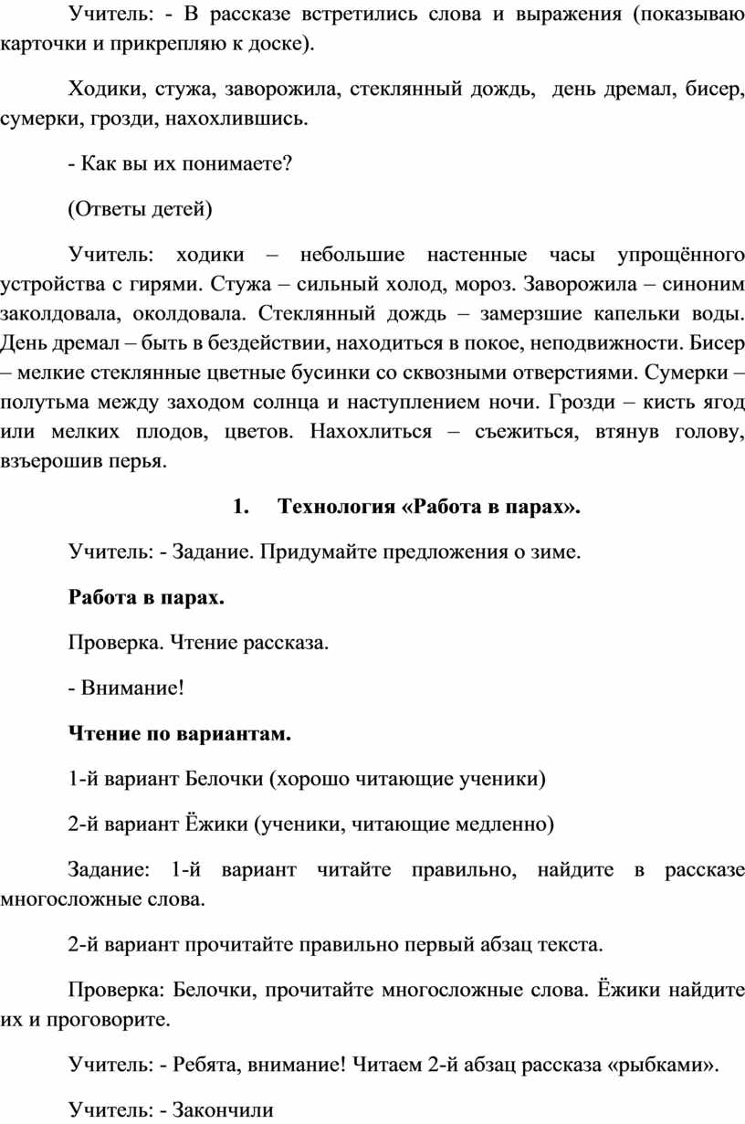 Учитель: ходики – небольшие настенные часы упрощённого устройства с гирями. Стужа – сильный холод, мороз. Заворожила – синоним заколдовала, околдовала. Стеклянный дождь – замерзшие капельки воды. День дремал – быть в бездействии, находиться в покое, неподвижности. Бисер – мелкие стеклянные цветные бусинки со сквозными отверстиями. Сумерки – полутьма между заходом солнца и наступлением ночи. Грозди – кисть ягод или мелких плодов, цветов. Нахохлиться – съежиться, втянув голову, взъерошив перья.