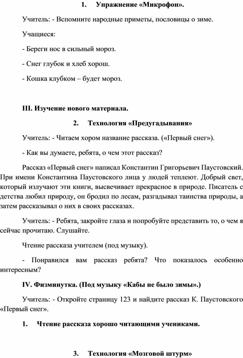 Учитель: - Откройте страницу 123 и найдите рассказ К. Паустовского «Первый снег».