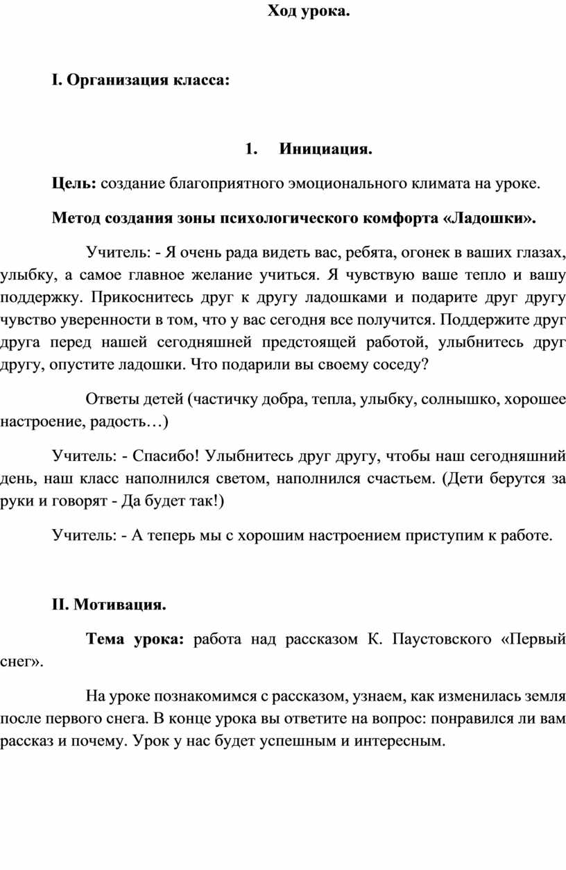 Учитель: - Я очень рада видеть вас, ребята, огонек в ваших глазах, улыбку, а самое главное желание учиться. Я чувствую ваше тепло и вашу поддержку. Прикоснитесь друг к другу ладошками и подарите друг другу чувство уверенности в том, что у вас сегодня все получится. Поддержите друг друга перед нашей сегодняшней предстоящей работой, улыбнитесь друг другу, опустите ладошки. Что подарили вы своему соседу?