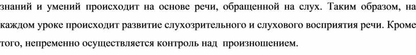 Итак, новый материал и материал заключительных по темам уроков, на которых, предполагается более высокий уровень обобщения знаний, должен даваться на слухозри-тельной основе. Организация деятельности детей на уроках, повторение и закрепление знаний и умений происходит на основе речи, обращенной на слух. Таким образом, на каждом уроке происходит развитие слухозрительного и слухового восприятия речи. Кроме того, непременно осуществляется контроль над произношением.