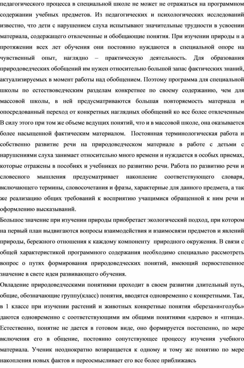 Содержание уроков природоведения, в отличие от уроков по разделу «Родная природа», сходно с программой массовой школы. На этих уроках решаются, в основном, те же образовательно –воспитательные задачи. Однако коррекционная сущность педагогического процесса в специальной школе не может не отражаться на программном содержании учебных предметов. Из педагогических и психологических исследований известно, что дети с нарушением слуха испытывают значительные трудности в усвоении материала, содержащего отвлеченные и обобщающие понятия. При изучении природы н а протяжении всех лет обучения они постоянно нуждаются в специальной опоре на чувственный опыт, наглядно – практическую деятельность. Для образования природоведческих обобщений им нужен относительно большой запас фактических знаний, актуализируемых в момент работы над обобщением. Поэтому программа для специальной школы по естествоведческим разделам конкретнее по своему содержанию, чем для массовой школы, в ней предусматриваются большая повторяемость материала и опосредованный переход от конкретных наглядных обобщений ко все более отвлеченным В силу этого при том же объеме ведущих понятий, что и в массовой школе, она оказывается более насыщенной фактическим материалом. Постоянная терминологическая работа и собственно развитие речи на природоведческом материале в работе с детьми с нарушениями слуха занимает относительно много времени и нуждается в особых приемах, которые отражены в пособиях и учебниках по развитию речи. Работа по развитию речи и словесного мышления предусматривает накопление соответствующего словаря, включающего термины, словосочетания и фразы, характерные для данного предмета, а так же реализацию общих требований к восприятию учащимися обращенной к ним речи и оформлению высказываний.
