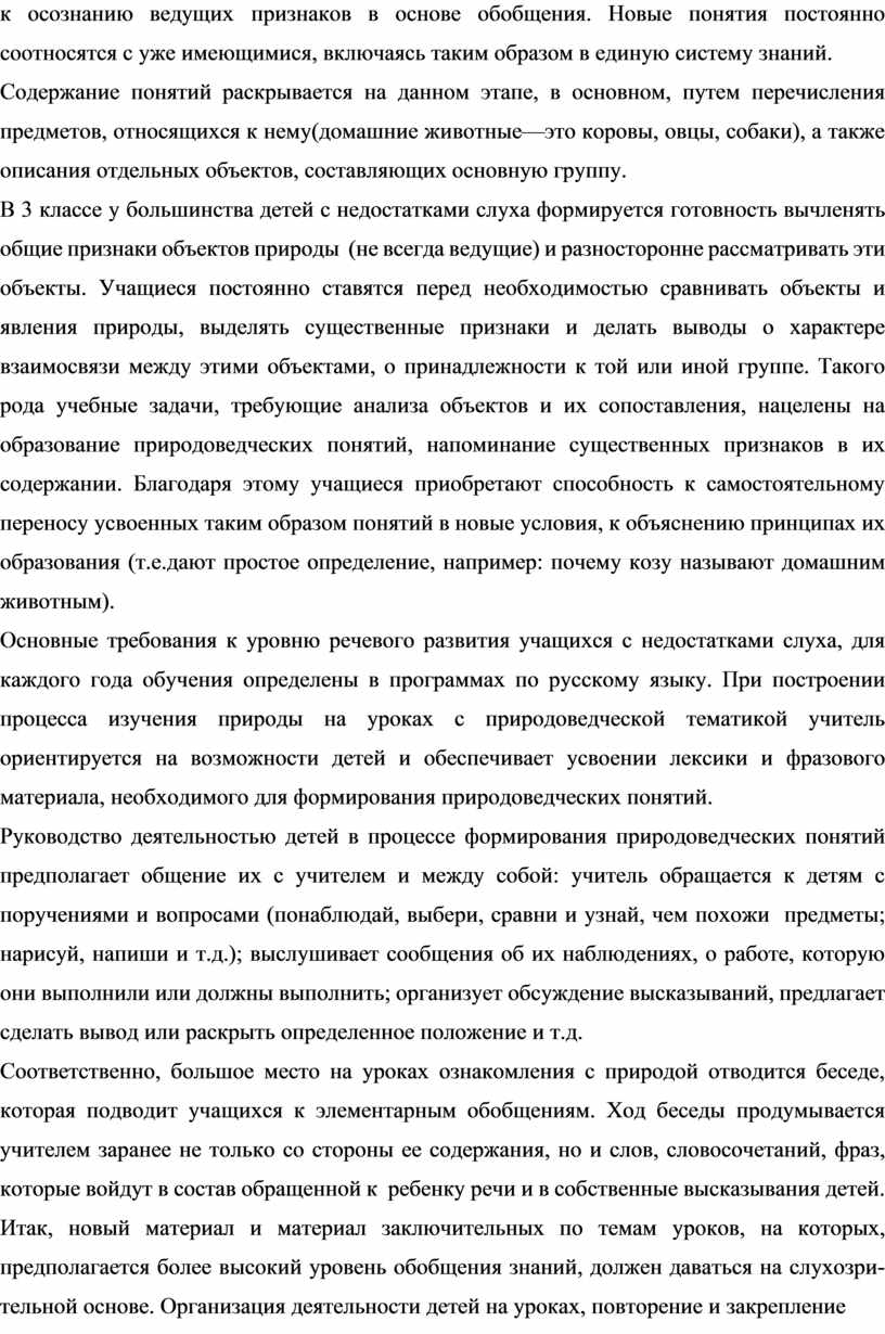Изучение природы вооружает учащихся природоведческими знаниями и умениями, содействует развитию их познавательных способностей; оно необходимо для гармонического развития личности. Выполнение этих важных и сложных задач в специальной школе связано со значительными трудностям. Их чувственный опыт и, соответственно, представления об окружающем мире к началу обучения в школе оказываются беднее, чем слышащих. Поэтому на первоначальном этапе изучения природы особую значимость приобретает специальная работа по обогащению и уточнению фактических представлений и элементарных обобщении и одновременно с формированием речи и словесного мышления. Это позволяет наряду с другими направлениями подготовки поднять уровень знаний и обеспечить возможность последующего изучения природы. У слышащего ребенка мышление и развитие опирается на одновременное усвоение языковых средств и поэтому рано приобретает свойство обобщать, систематизировать представления об окружающем мире. Отставание и своеобразие развития речи у ребенка с нарушениями слуха ведет к серьезной задержке в развитии обобщающей функции мышления. Вследствие этого наблюдается резкий разрыв в образовании наглядных обобщений и образовании отвлеченных, которое запаздывает. Преодоление этого разрыва и успешное овладение природоведческими знаниями является в значительной мере результатом специальной работы над речью детей с нарушенным слухом.