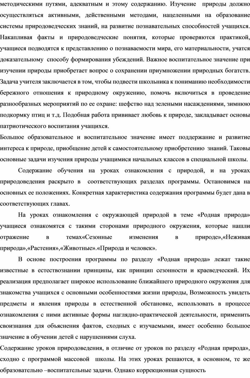 В основе построения программы по разделу «Родная природа» лежат такие известные в естествознании принципы, как принцип сезонности и краеведческий. Их реализация предполагает широкое использование ближайшего природного окружения для знакомства учащихся с основными особенностями жизни природы, Возможность увидеть предметы и явления природы в естественной обстановке, использовать в процессе ознакомления с ними активные формы наглядно-практической деятельности, применить своизнания для объяснения фактов, сходных с изучаемыми, имеет особенно большое значение в обучении детей с нарушениями слуха.