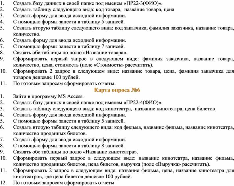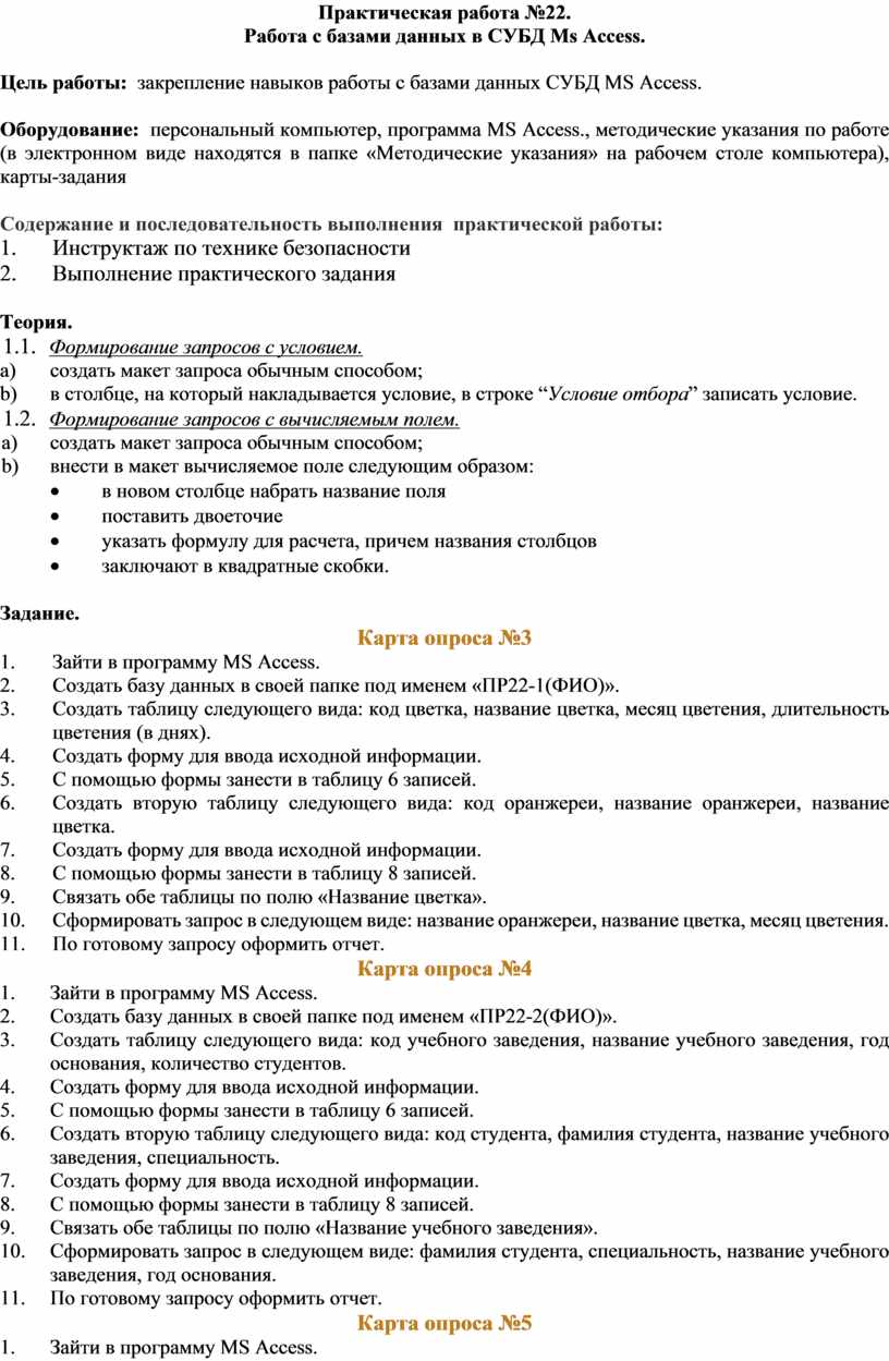 Оборудование: персональный компьютер, программа MS Access., методические указания по работе (в электронном виде находятся в папке «Методические указания» на рабочем столе компьютера), карты-задания