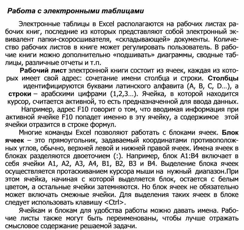 Многие команды Excel позволяют работать с блоками ячеек. Блок ячеек – это прямоугольник, задаваемый координатами противополож- ных углов, обычно, верхней левой и нижней правой ячеек. Имена ячеек в блоках разделяются двоеточием (:). Например, блок А1:В4 включает в себя ячейки А1, А2, А3, А4, В1, В2, В3 и В4. Выделение блока ячеек осуществляется протаскиванием курсора мыши на нужный диапазон. При этом ячейка, начиная с которой выделяется блок, остается с белым цветом, а остальные ячейки затемняются. Но блок ячеек не обязательно может включать смежные ячейки. Для выделения таких ячеек в блоке следует использовать клавишу <Ctrl>.