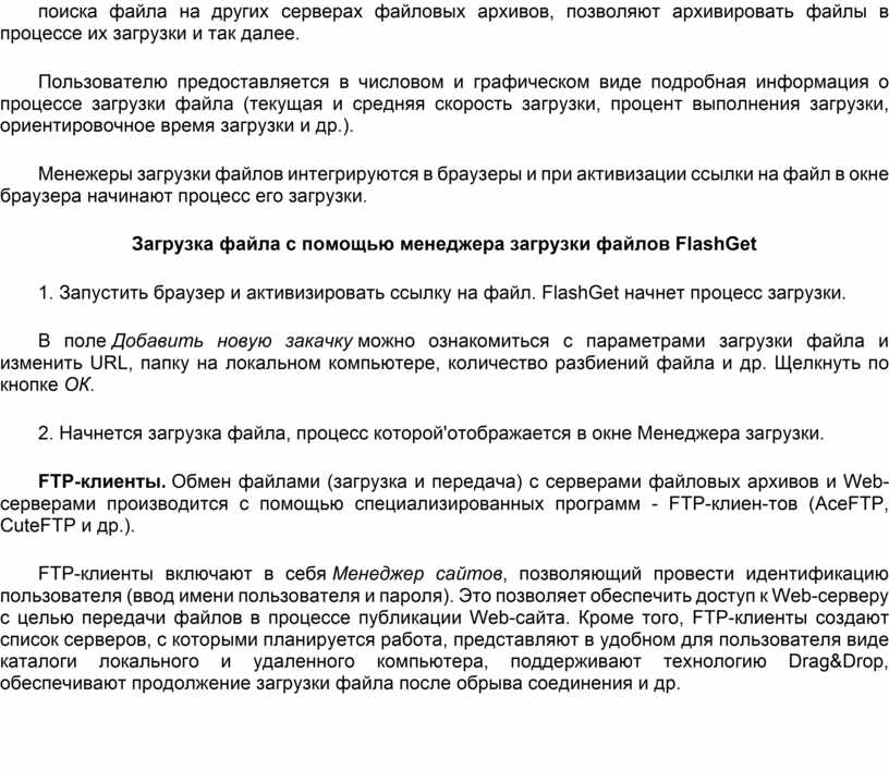 Протокол передачи файлов (FTP). Доступ к файлам на серверах файловых архивов возможен как по протоколу HTTP, так и по специальному протоколу передачи файлов FTP (File Transfer Protocol). Протокол FTP позволяет не только загружать файлы (Download) с удаленных серверов файловых архивов на локальный компьютер, но и, наоборот, производить передачу файлов (Upload) с локального компьютера на удаленный Web-сервер, например, в процессе публикации Web-сайта.