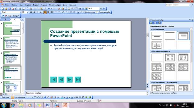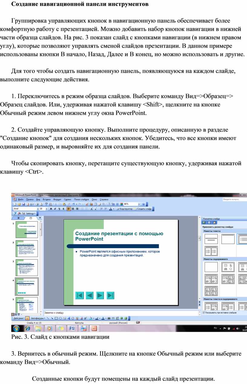 Группировка управляющих кнопок в навигационную панель обеспечивает более комфортную работу с презентацией. Можно добавить набор кнопок навигации в нижней части образца слайдов. На рис. 3 показан слайд с кнопками навигации (в нижнем правом углу), которые позволяют управлять сменой слайдов презентации. В данном примере использованы кнопки В начало, Назад, Далее и В конец, но можно использовать и другие.