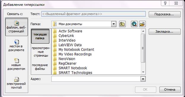 2. Выполните команду Вставка=>Гиперссылка или щелкните на кнопке Добавить гиперссылку. Откроется диалоговое окно Добавление гиперссылки.