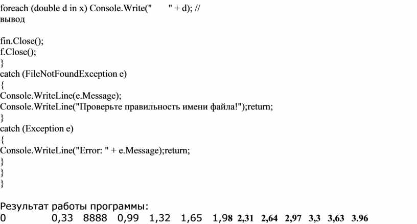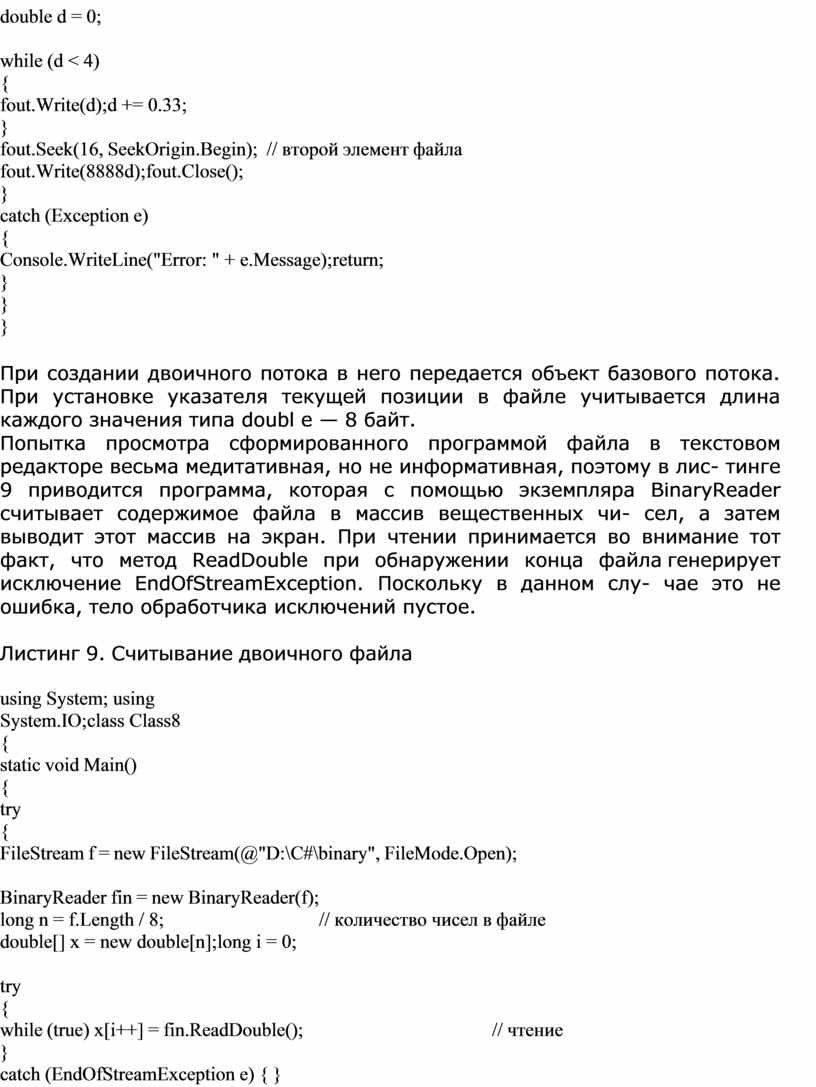 Попытка просмотра сформированного программой файла в текстовом редакторе весьма медитативная, но не информативная, поэтому в лис- тинге 9 приводится программа, которая с помощью экземпляра BinaryReader считывает содержимое файла в массив вещественных чи- сел, а затем выводит этот массив на экран. При чтении принимается во внимание тот факт, что метод ReadDouble при обнаружении конца файла генерирует исключение EndOfStreamException. Поскольку в данном слу- чае это не ошибка, тело обработчика исключений пустое.