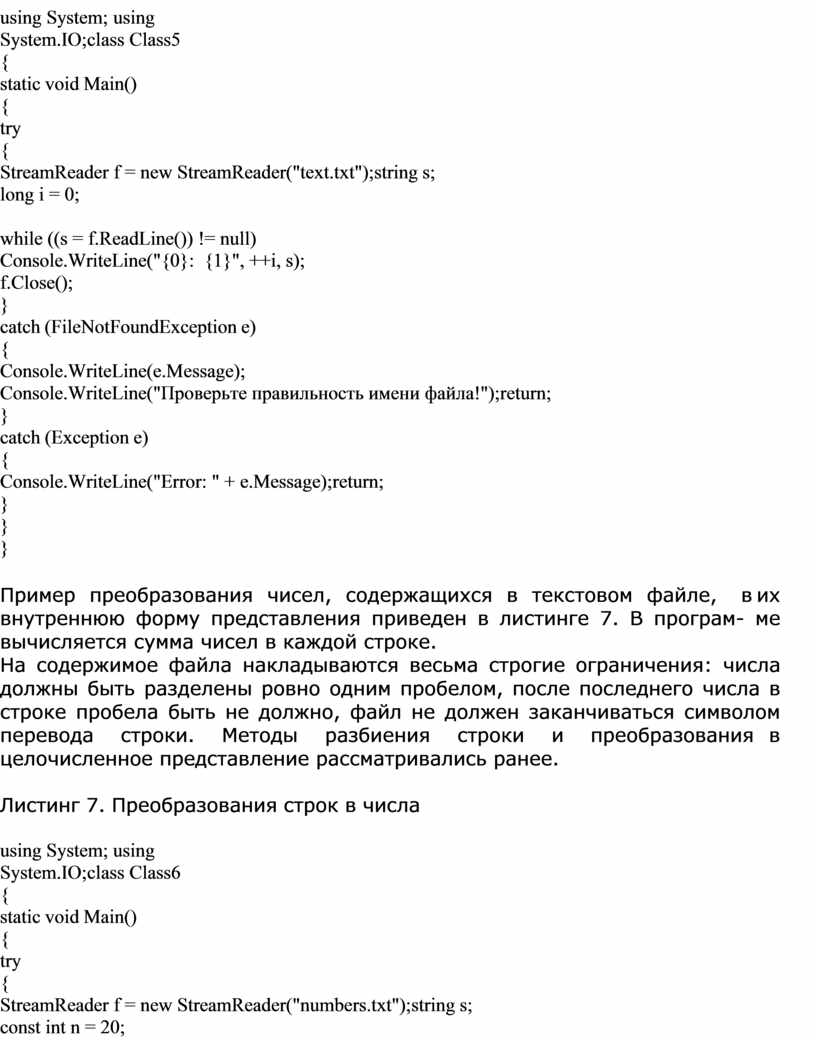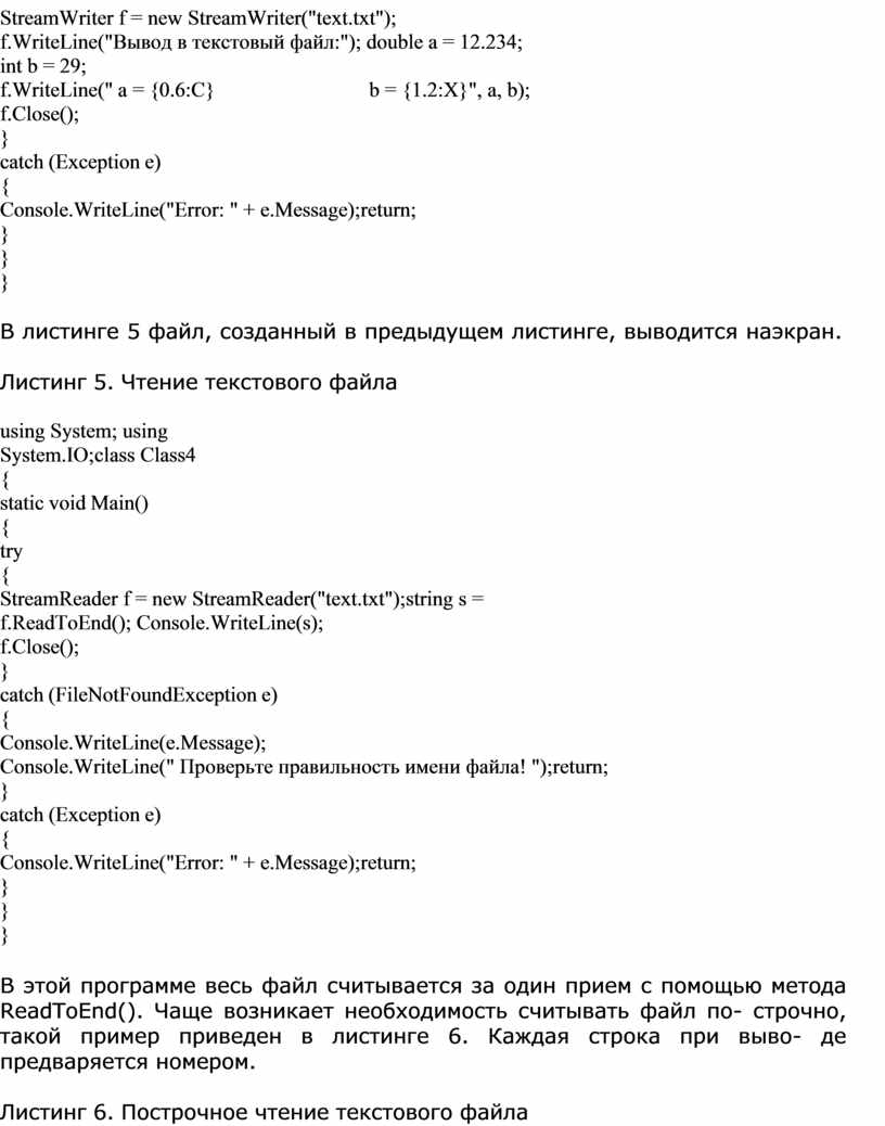 В этой программе весь файл считывается за один прием с помощью метода ReadToEnd(). Чаще возникает необходимость считывать файл по- строчно, такой пример приведен в листинге 6. Каждая строка при выво- де предваряется номером.