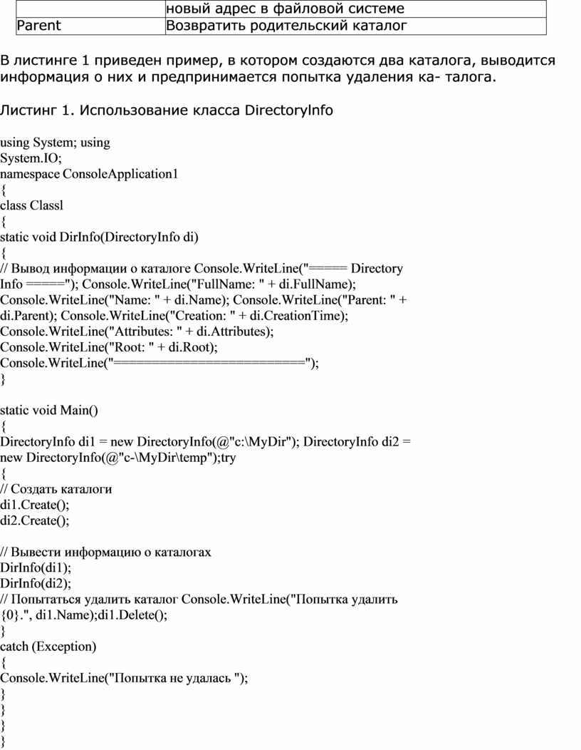 Класс Directory Info содержит элементы, позволяющие выполнять не- обходимые действия с каталогами файловой системы. Эти элементы пе- речислены в табл. 2.